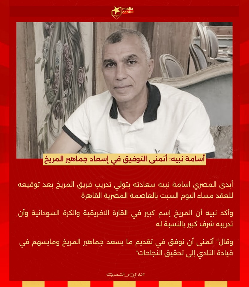 وأكد أسامة نبيه، أن نادي المريخ اسم كبير في القارة الإفريقية والكرة السودانية وأن تدريبه شرف كبير بالنسبة له.