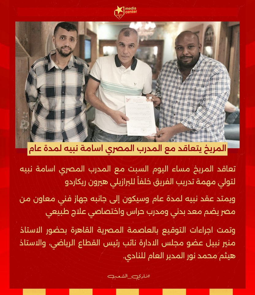 ونشر نادي المريخ السوداني عبر حسابه الرسمي على موقع التواصل الاجتماعي فيسبوك، صورة للمدرب الجديد وعلق عليها قائلا: تعاقد المريخ مساء اليوم السبت مع المدرب المصري أسامة نبيه لتولي مهمة تدريب الفريق خلفا للبرازيلي هيرون ريكاردو.