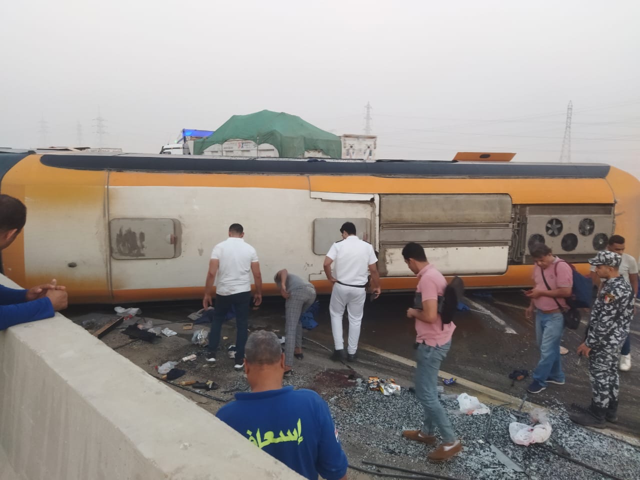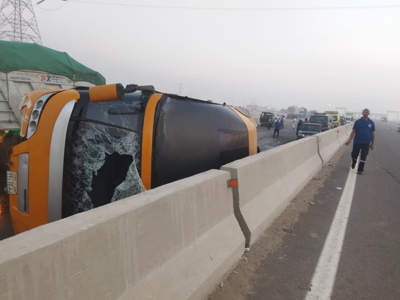 وتلقت الأجهزة الأمنية إخطارا من غرفة عمليات شرطة النجدة، بانقلاب أتوبيس يحمل لوحات معدنية ي.ف.ج 325، على طريق الجيش بين نفق أطفيح وكارتة الكريمات في اتجاه محافظة بني سويف، ما نتج عنه إصابة 16 راكبا بإصابات متفرقة، فجرى التوجيه بانتقال سيارات الإسعاف ونقل المصابين إلى أقرب مستشفى.