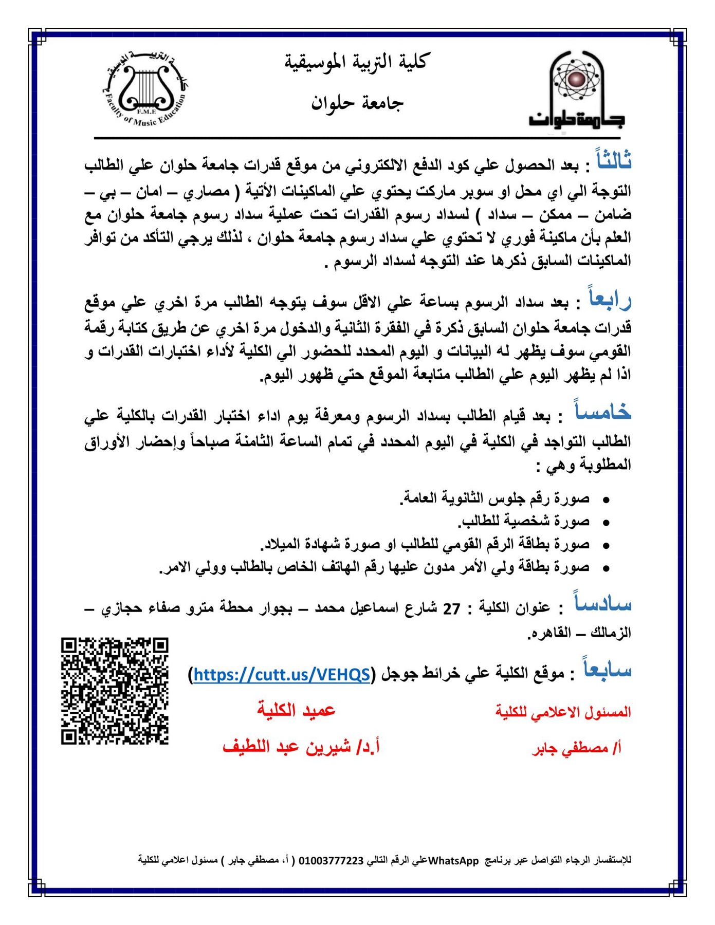 - وأخيرا لابد أن يكون مجموع الطالب في الثانوية العامة متوافقا مع درجات تنسيق كلية التربية الموسيقية جامعة حلوان والتي يتم إعلانه الفترة القادمة.