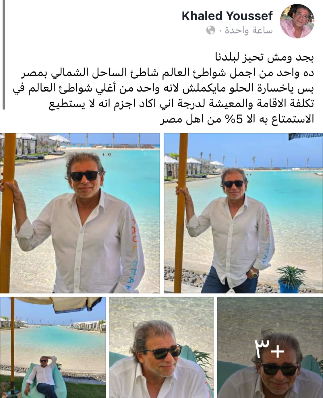 وقال خالد يوسف، عبر حسابه الشخصي بمواقع التواصل الاجتماعي فيسبوك: بجد ومش تحيز لبلدنا ده واحد من أجمل شواطيء العالم شاطيء الساحل الشمالي بمصر.