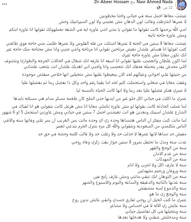 ووصف ناصر أحمد زوجته بكلمات لا مثيل لها، قائلًا: مفيش حد نساها لأنها عمرها لا خذلت حد ولا زعلت حد ولا قالت كلمة وحشة في حق حد، كانت الجنة بتظهر في وشها لما تضحك، كانت العيد في كل عيد.