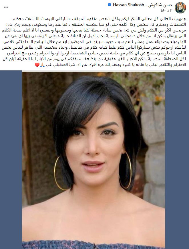 وأضاف حسن شاكوش: ومش فاهم سبب وجود سيرتها في الموضوع إيه من خلال البرامج أنا دلوقتي كلامي للإعلام أرجوكم بلاش تشاركوا الناس كلام غلط كفاية كلام في تفاصيل وحياة شخصية اللي ظاهر للناس يخص الناس أنا دلوقتي بمتنع عن أي كلام في حاجة تخص حياتي الشخصية أرجوا احترام رغبتي وكل التقدير ليكي يا فنانة يا كبيرة وبعتذر ليك مرة أخرى عن أي شئ اتحطيتي فيه.
