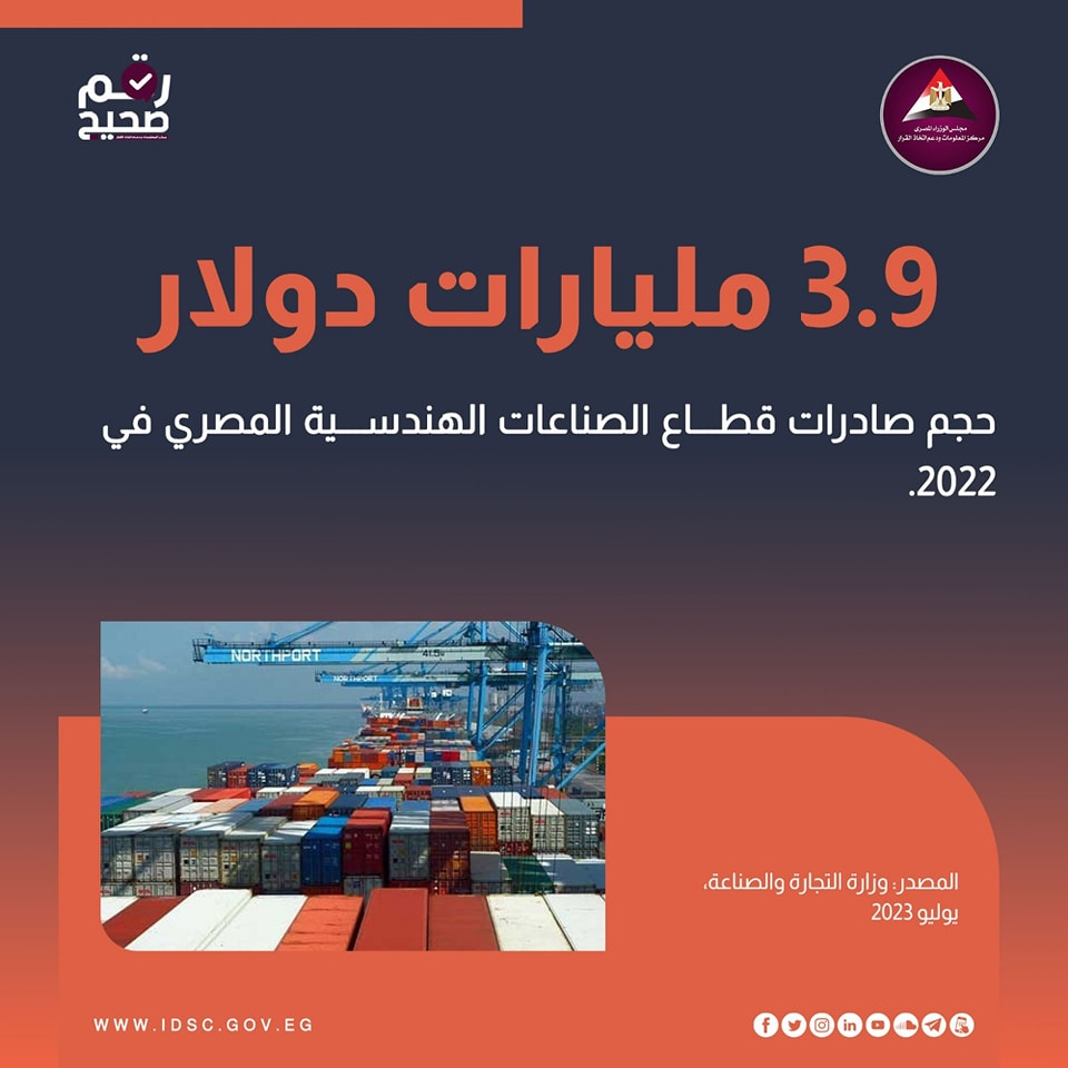 نشر مركز المعلومات ودعم اتخاذ القرار التابع لـ مجلس الوزراء، انفوجرافًا على صفحته الرسمية على موقع التواصل الاجتماعي فيسبوك سلط الضوء من خلاله على حجم صادرات قطاع الصناعات الهندسية المصري في عام 2022.