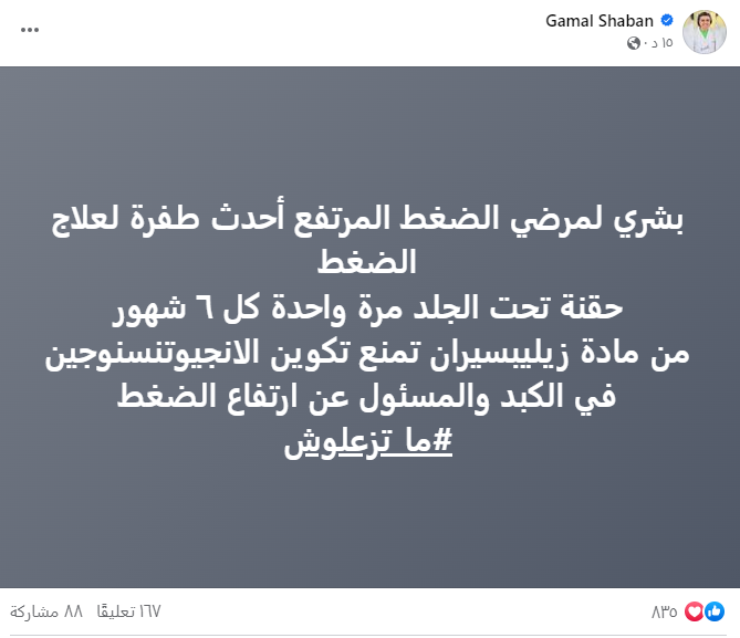 وأضاف شعبان عبر صفحته الرسمية على موقع التواصل الاجتماعي فيس بوك، أن هناك حقنة تحت الجلد تأخذ مرة واحدة كل 6 أشهر مكونة من مادة زيليبسيران تمنع تكوين الإنجيوتنسنوجين في الكبد المسؤول عن ارتفاع ضغط الدم.