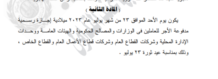 ونوه القرار بأن الإجازة رسمية مدفوعة الأجر للعاملين في الوزارات والمصالح الحكومية والهيئات العامة ووحدات الإدارة المحلية وشركات القطاع العام وشركات قطاع الأعمال العام والقطاع الخاص، وذلك بمناسبة عيد ثورة 23 يوليو.