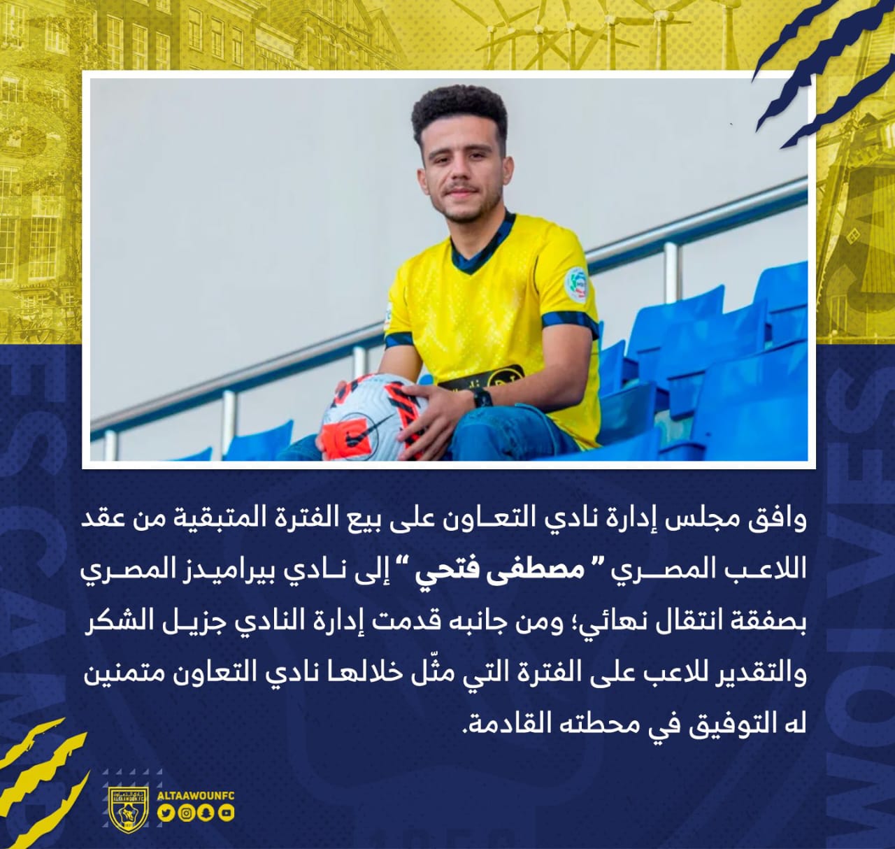وقال التعاون السعودي في بيان رسمي: وافق مجلس إدارة نادي التعاون على بيع الفترة المتبقية من عقد اللاعب المصري مصطفى فتحي إلى نادي بيراميدز المصري بصفقة انتقال نهائي.