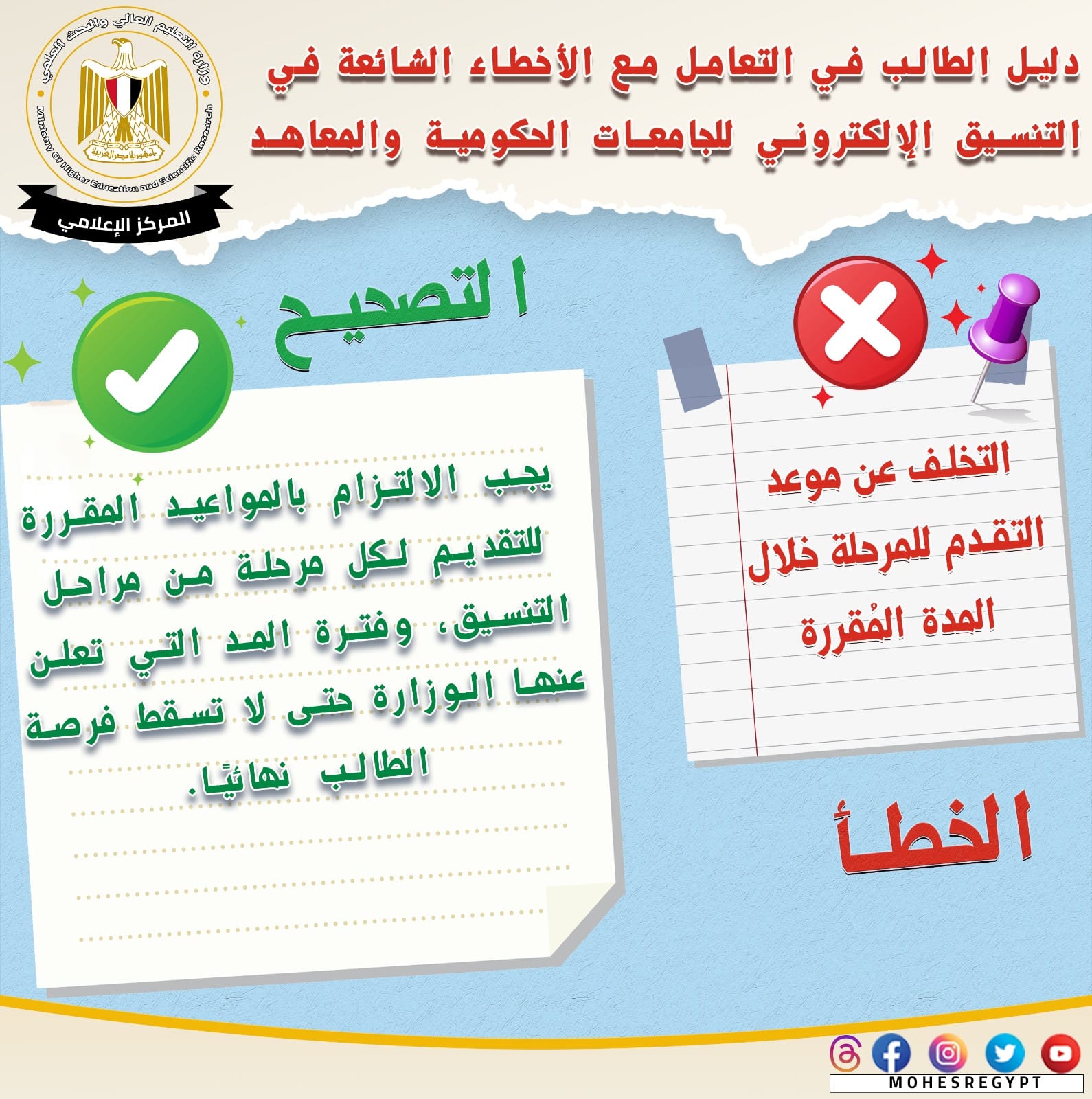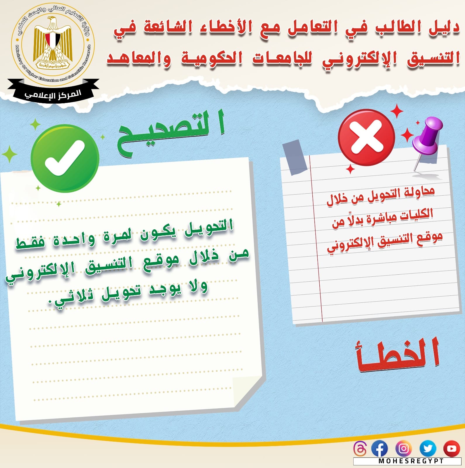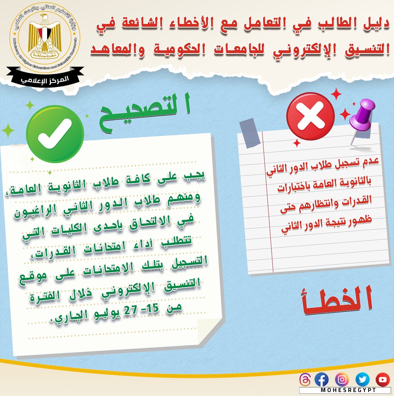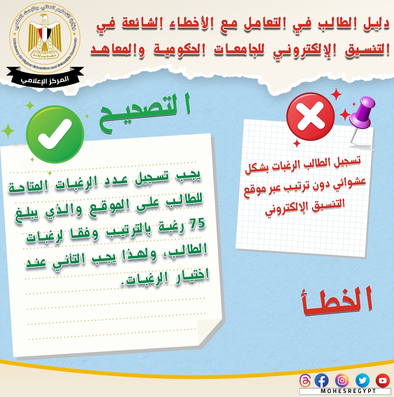 وأضاف عبدالغفار، أن الدليل الحالي يرصد أبرز الأخطاء الشائعة في التنسيق الإلكتروني التي يقع فيها طلاب الثانوية العامة، ويتناول الدليل الإرشادي كيفية تصويب هذه الأخطاء حتى يتجنب الطلاب الوقوع فيها، خلال فترة التنسيق للالتحاق بالجامعات الحكومية والمعاهد، ولمعرفة الدليل عبر هذا الرابط.