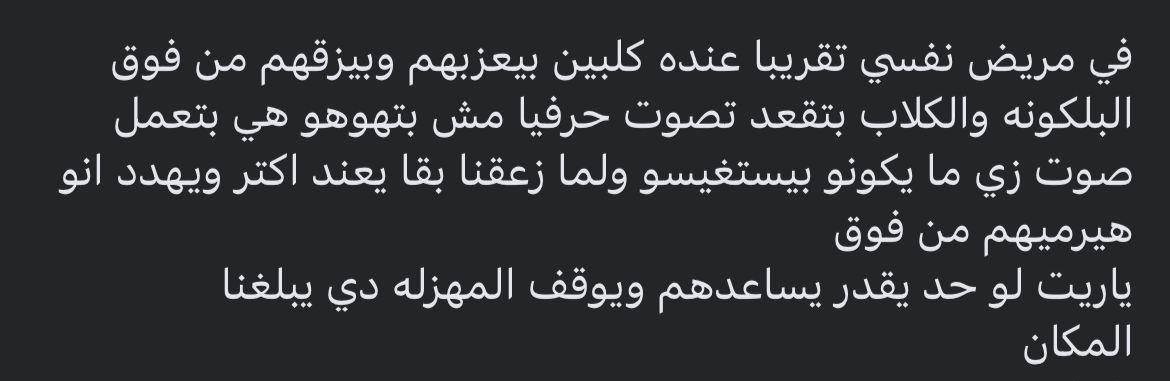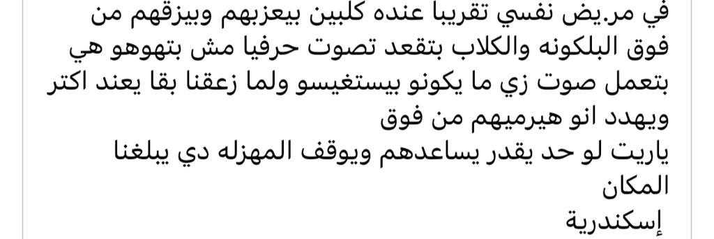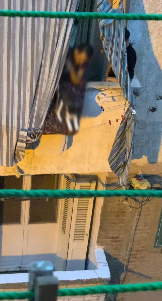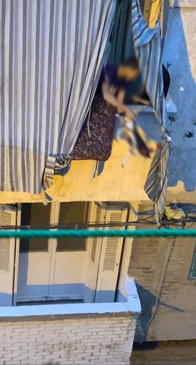 و قال الشخص الذي التقط الصور: فيه مريض نفسي تقريبا عنده كلبين بيعذبهم وبيدفعهم من فوق البلكونة، والكلاب بتقعد تصوت حرفيا مش بتهوهو هي بتعمل صوت زي ما يكونوا بيستغيثوا ولما زعقنا بقى يعند أكتر، ويهدد إنه سيلقيهم من فوق، يا ريت لو حد يقدر يساعدهم ويوقف المهزلة دي يبلغنا.