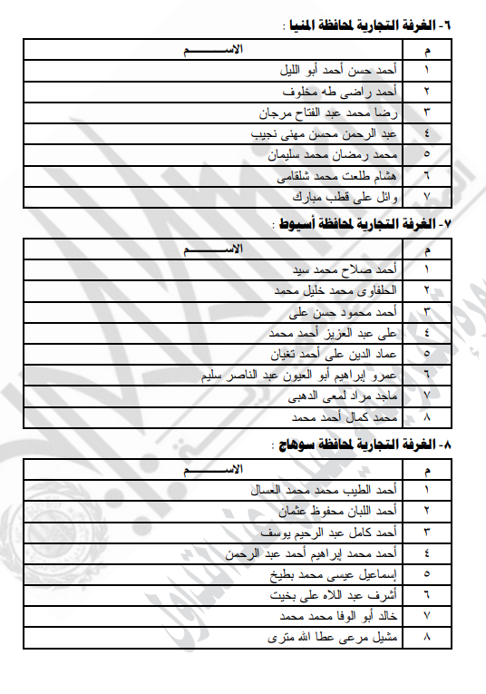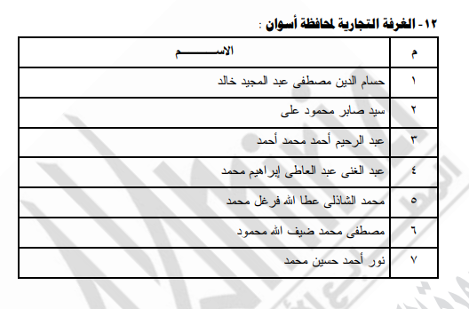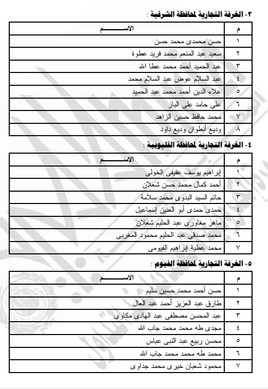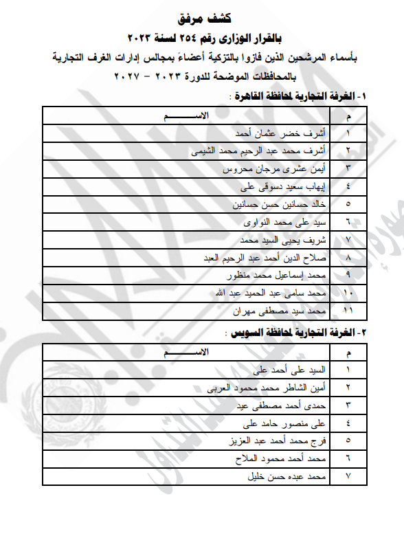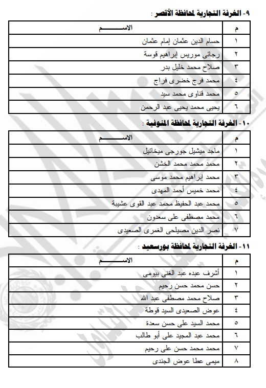 وقررت المادة الأولى، أن يعلن فوز المرشحين المبين أسماؤهم بالكشف المرفق بالتزكية أعـضاء بمجالس إدارات الغرف التجارية لمحافظات القاهرة - السويس - الشرقية - القليوبية - الفيوم - أسيوط - سوهاج - المنيا - الأقصر - بورسعيد - المنوفية - أسـوان، للدورة الانتخابية 2023/2027 اعتبارا من تاريخ نشر هذا القرار.