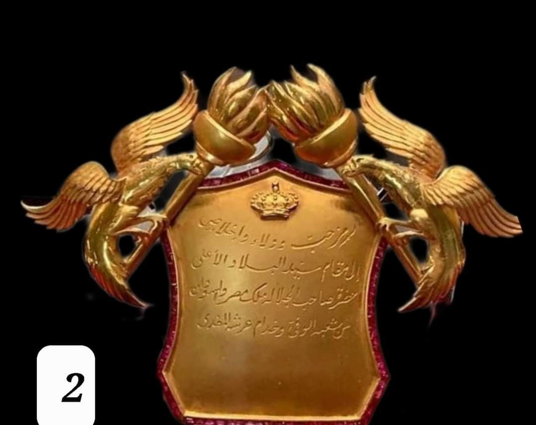 - درع من الذهب يعلوه التاج الملكي تم إهداؤه لجلاله الملك فاروق الأول كرمز للوفاء والإخلاص من الشعب المصري.