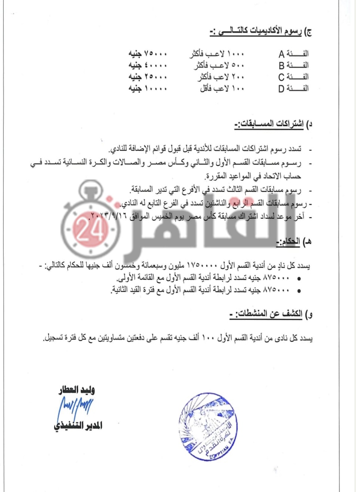 ونصت لائحة شروط القيد الجديدة على إلزام كل ناد من أندية القسم الأول (الدوري الممتاز) بسداد مبلغ مليون و750 ألف جنيه للحكام، على أن يسدد هذا المبلغ على دفعتين بواقع 875 ألف جنيه لكل دفعة، وتسدد الدفعة الأولى خلال فترة الانتقالات الصيفية الحالية، والدفعة الثانية خلال فترة الانتقالات الشتوية المقبلة.