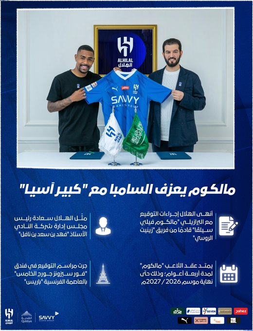 ونشر نادي الهلال فيديو عبر حسابه الرسمي على تويتر، يعلن خلاله التعاقد مع مالكوم في الميركاتو الصيفي الحالي، قادما من صفوف نادي زينيت الروسي.