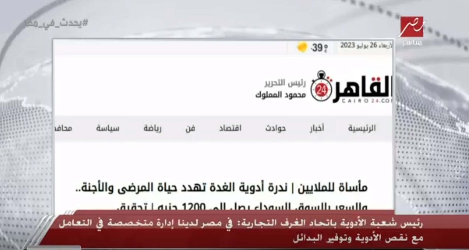 وأضاف رئيس شعبة الأدوية باتحاد الغرف التجارية، خلال حوار مع الإعلامي شريف عامر ببرنامج يحدث في مصر، المذاع على MBC مصر، أن 90 % من الأدوية المصنعة في مصر تتكون من مواد فعالة مستوردة، أدوية الغدد الصماء متوفر في مصر وهناك مخزون منها يكفي لمدة عام.