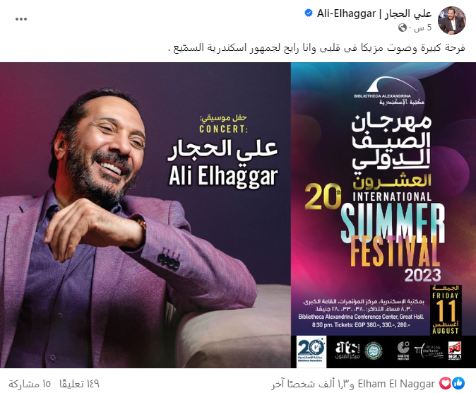 يستعد الفنان علي الحجار لإحياء حفل جماهيري بمكتبة الإسكندرية يوم الجمعة الموافق 11 أغسطس الجاري، ضمن فعاليات مهرجان الصيف الدولي في دورته الـ 20.