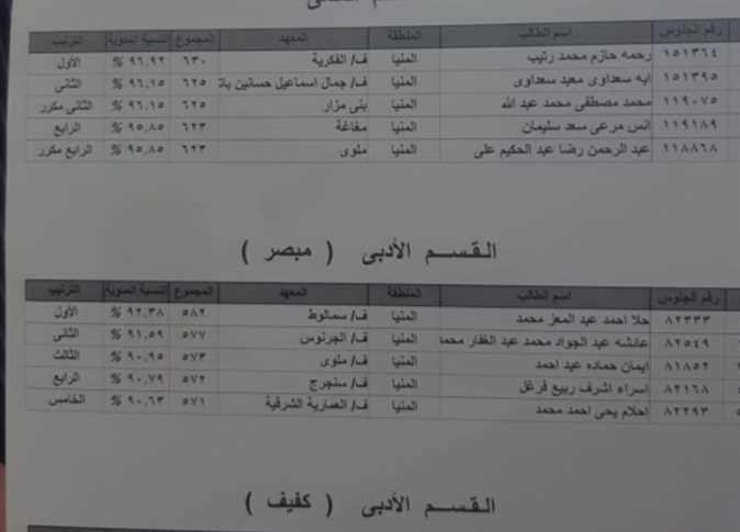 وقال الشيخ على حسن، مدير إدارة الامتحانات بالمنطقة، إن أسماء الأوائل للقسم العلمي هم: رحمة حازم محمد رتيب، معهد فتيات الفكرية بأبوقرقاص، المركز الأول بمجموع درجات 630 درجة، وفي المركز الثاني آية سعدادي معبد، معهد فتيات جمال اسماعيل، بمجموع درجات 625 درجة، محمد مصطفى محمد عبدالله، بني مزار، 625 درجة، أنس مرعي سعد سليمان، مغاغة، بمجموع 623 درجة، عبدالرحمن رضا عبدالحكيم، 623 درجة.
