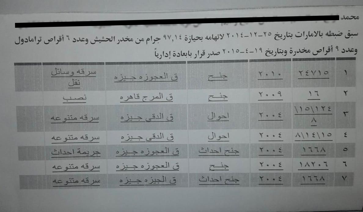 وحمل ملفه العديد من الجرائم بينها ضبطه بالأمارات بتاريخ 25-12-2014 لاتهامه بحيازة 14 جراما من مخدر الحشيش وعدد 6 أقراص ترامادول وعدد 9 أقراص مخدرة وبتاريخ 19 أبريل 2015 صدر قرار بإبعاده إداريًا من الإمارات.