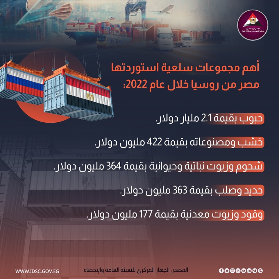 يواصل مركز المعلومات ودعم اتخاذ القرار بـ مجلس الوزراء نشر إنفوجرافات، يستعرض خلالها حجم الصادرات والواردات بين مصر وروسيا خلال عام 2022