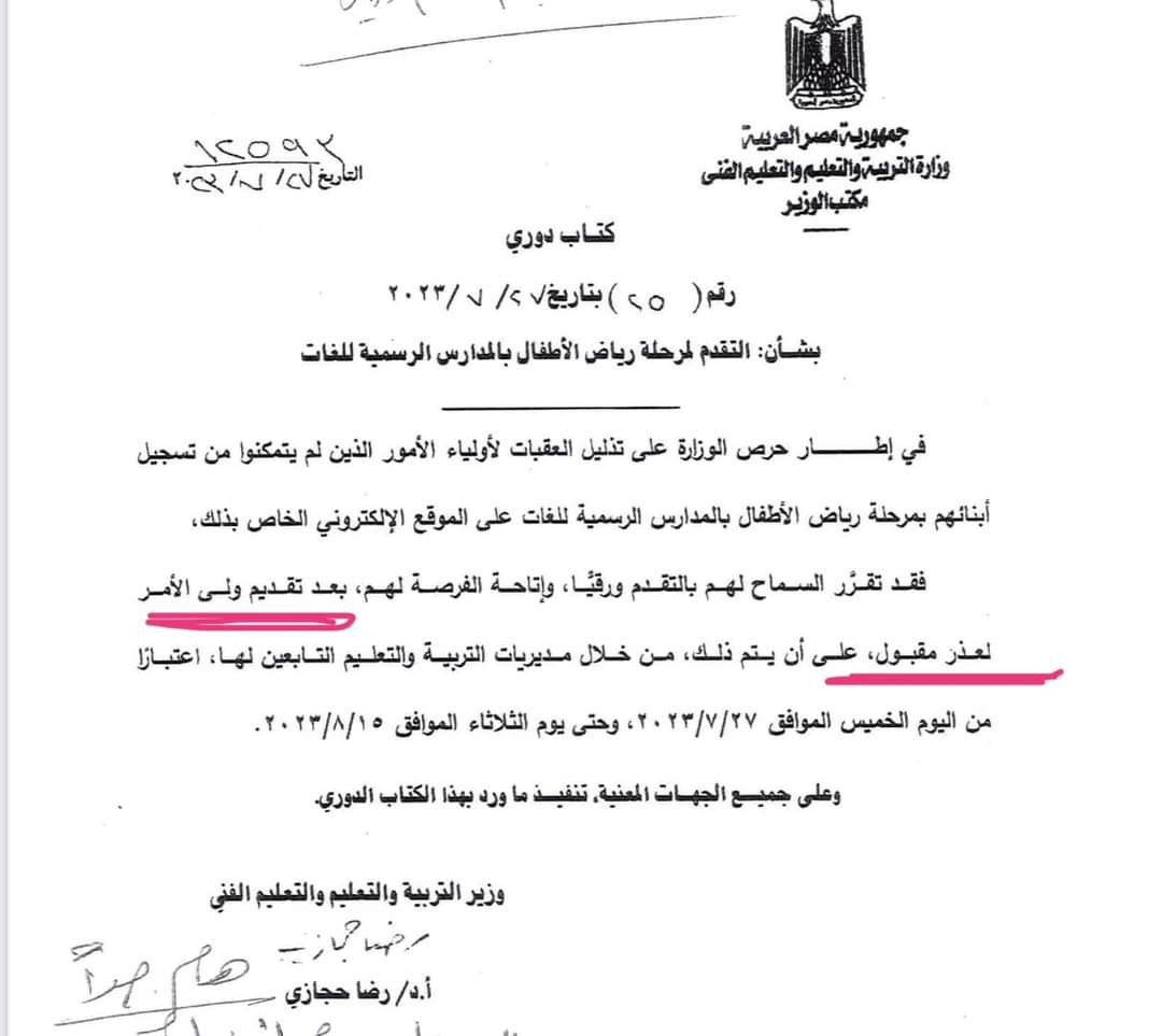 وأصدر الدكتور رضا حجازي، وزير التعليم العالي، القرار رقم 25 بتاريخ 27/7/2023 بشأن التقدم لمرحلة رياض الأطفال بالمدارس الرسمية للغات جاء نصه: في إطار حرص الوزارة على تذليل العقبات لأولياء الأمور الذين لم يتمكنوا في تسجيل أبنائهم بمرحلة رياض الأطفال بالمدارس الرسمية للغات على الموقع الإلكتروني الخاص بذلك، فقم تقرر السماح لهم بالتقدم ورقيا، وإتاحة الفرصة لهم بعم تقديم ولي الأمر عذر مقبول على ذلك، من خلال مديريات التربية والتعليم التابعين لها، اعتبارا الخميس الماضي حتى الثلاثاء الموافق 15/8/2023.