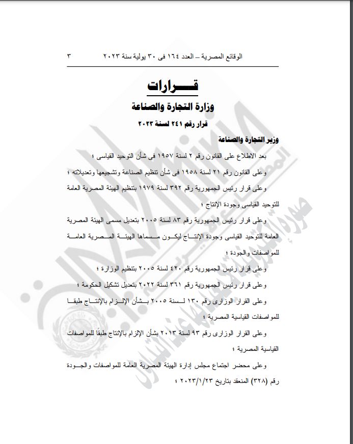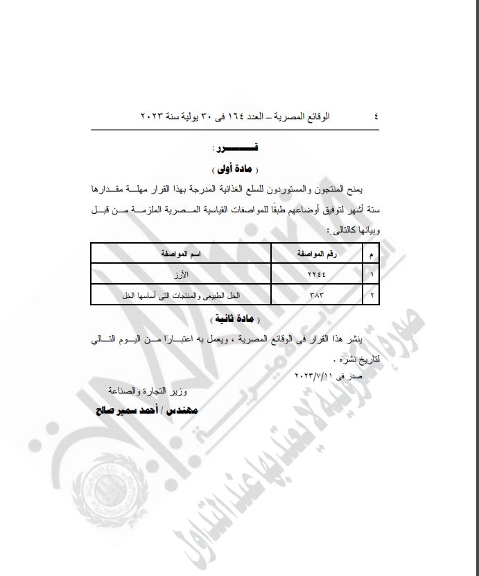 نشرت الجريدة الرسمية اليوم الأحد 30 يوليو 2023، قرار وزير التجارة والصناعة رقم 241 لسنة 2023 والخاص بمنح المنتجين والمستوردين للسع الغذائية من الأرز والخل، مهلة 6 أشهر لتوفيق أوضاعهم طبقا للمواصفات القياسية المصرية الملزمة.