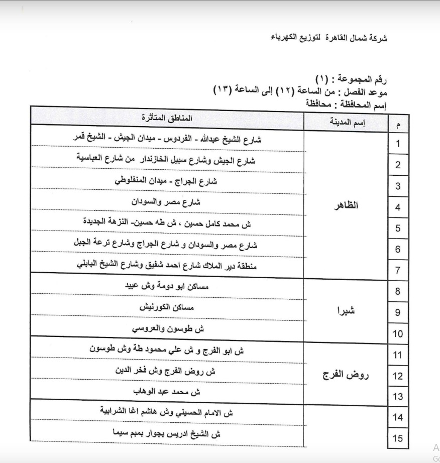وتضمنت جداول الحكومة بشأن خطة تخفيف الأحمال المناطق التالية: