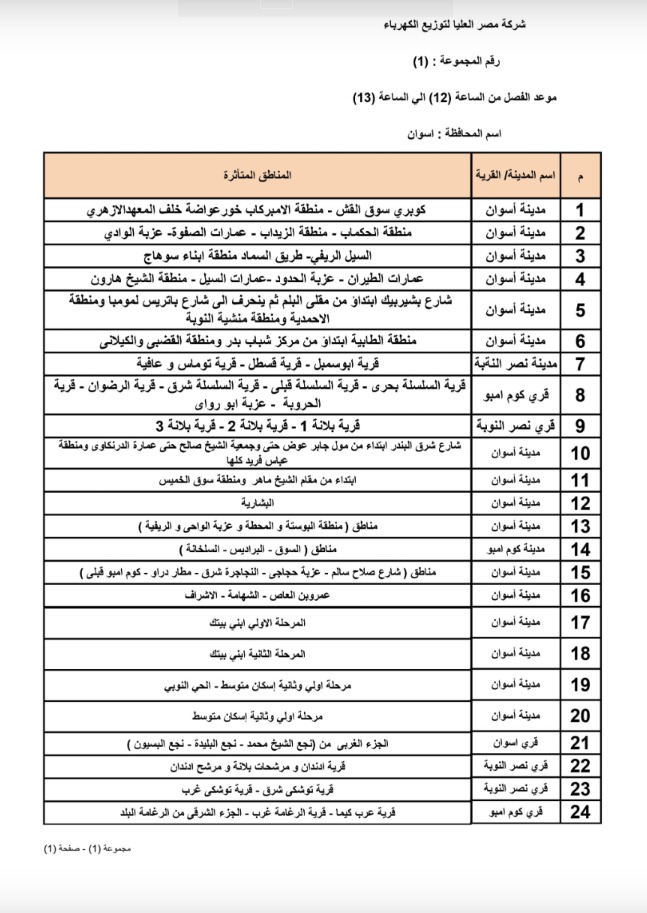 وننشر فيما يلي خطة تخفيف أحمال الكهرباء بالقاهرة وأسوان من 12 لـ 1 ظهرا.