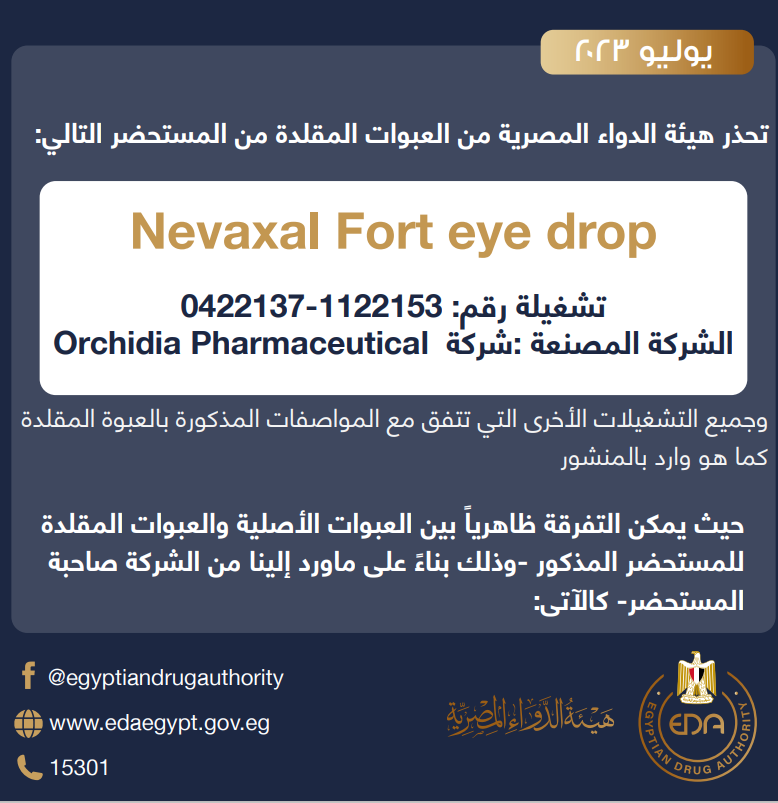 وأوضحت هيئة الدواء المصرية، في منشور لها، أن العبوات المقلدة من قطرة عين نيفكسال فورت، من التشغيلات رقم 1122153 و0422137، مشيرة إلى الفروق الظاهرية بين العبوات الأصلية والمقلدة والتي تتمثل في أن العبوة المقلدة لها تسلسل ثابت وهو 000000109251 (21).