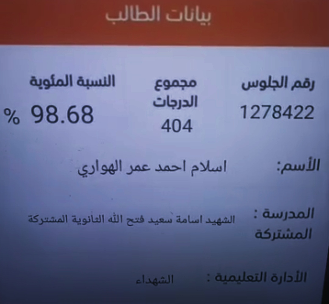 وأكدت إسلام أحمد الهواري بنت مركز الشهداء بمحافظة المنوفية طالبة الثانوية العامة لـ القاهرة 24، أن نتيجتها ظهرت على الإنترنت 98.1%، بالمركز السابع مكرر على الجمهورية، وانتظرت الأسرة إعلان اسمها ضمن الأوائل في مؤتمر الدكتور رضا حجازي وزير التربية والتعليم، لتتفاجأ بعدها بعدم ذكر اسمها.