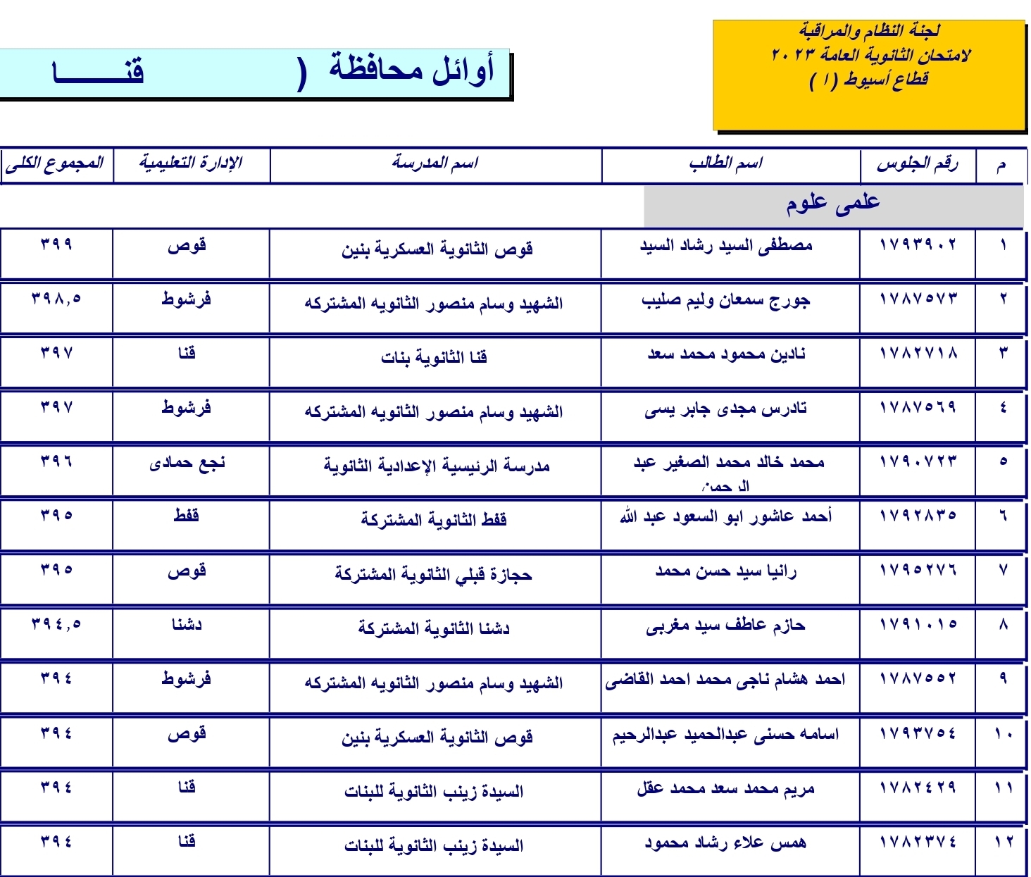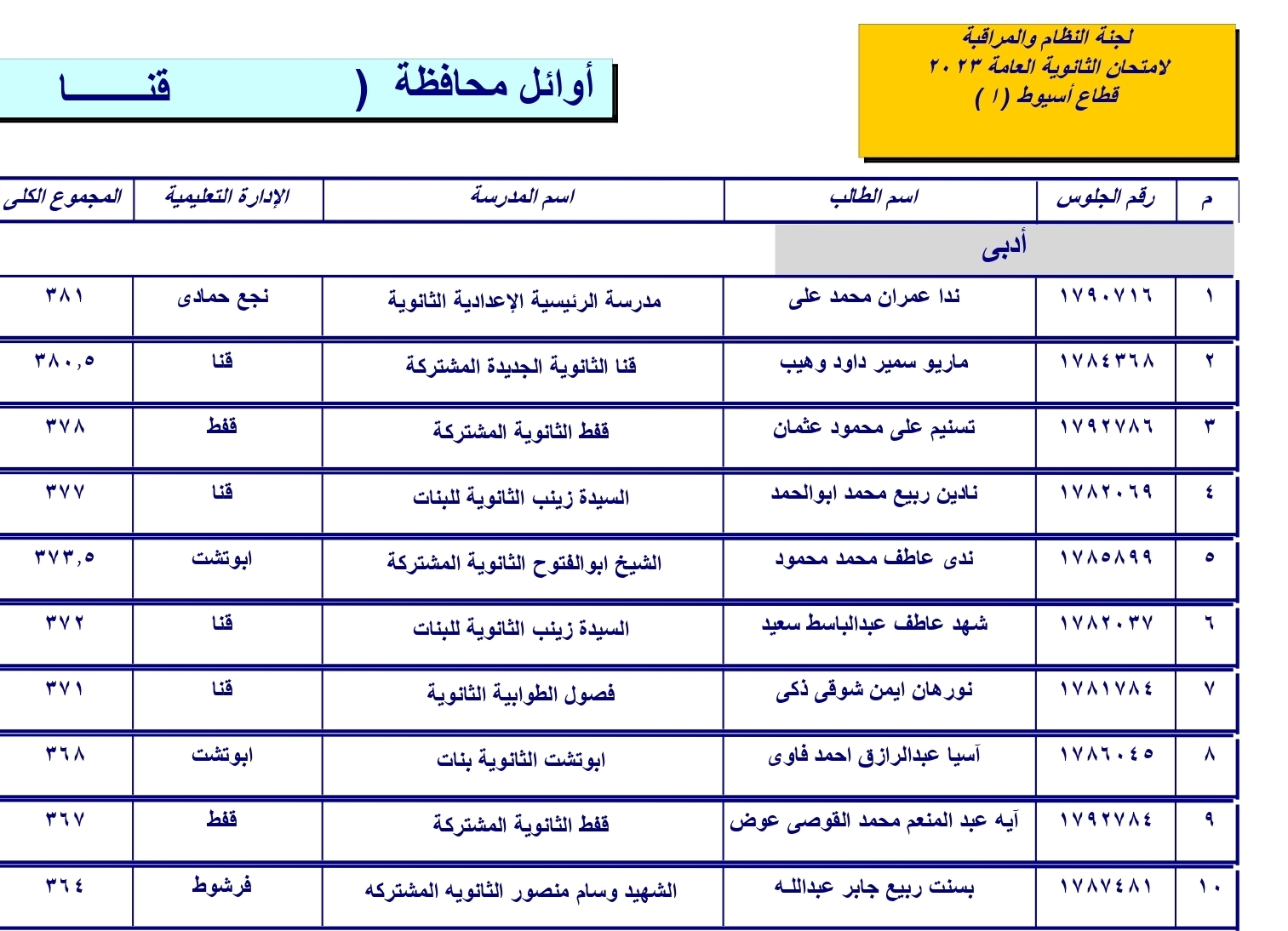 أعلن الدكتور محمد السيد وكيل وزارة التربية والتعليم بقنا، اليوم الأربعاء، أسماء الطلاب الأوائل بـ شهادة الثانوية العامة على مستوى المحافظة في الشعب الثلاث الأدبي وعلمي العلوم والرياضيات.