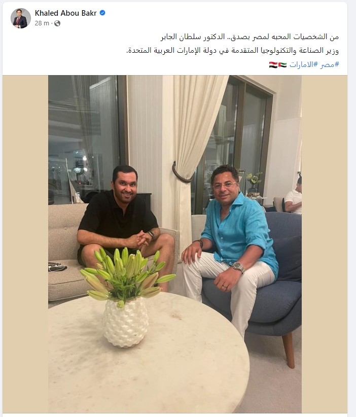 نشر المحامي خالد أبو بكر عبر حسابه على موقع التواصل الاجتماعي فيس بوك، صورة تجمعه مع الدكتور سلطان بن أحمد الجابر، وزير الصناعة والتكنولوجيا المتقدمة في دولة الإمارات.