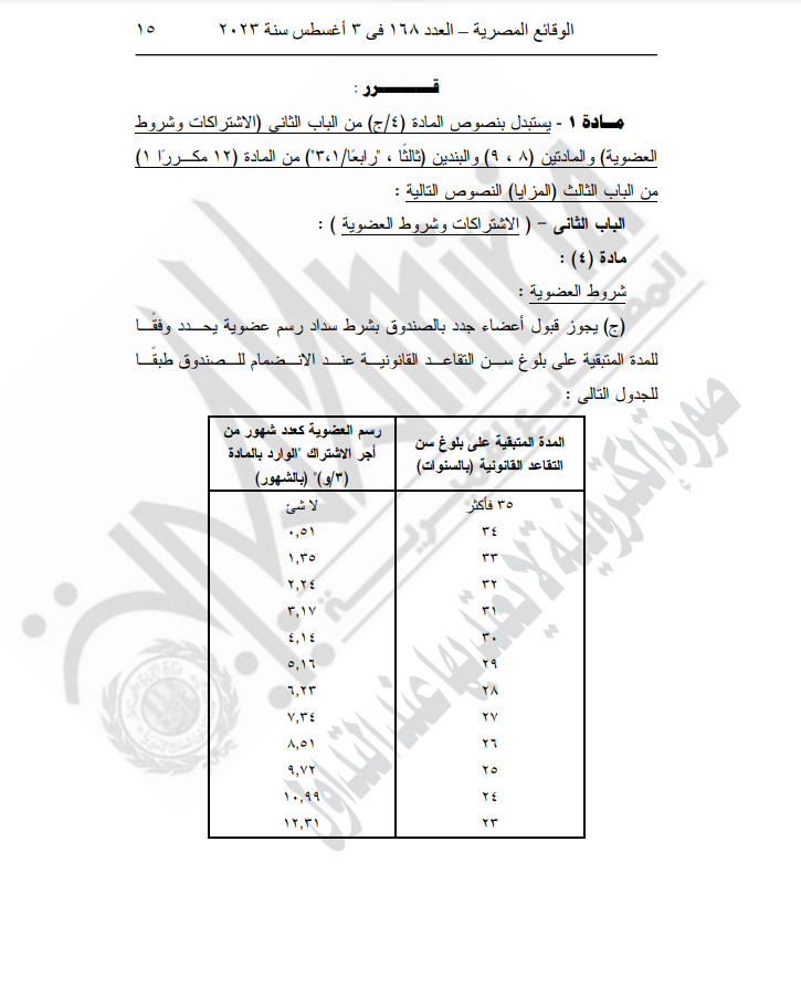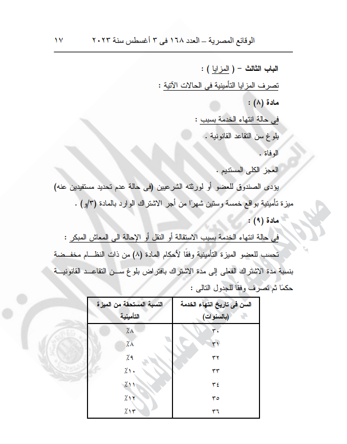 كما يتم صرف المزايا التأمينية في حالة انتهاء الخدمة أو العضوية لأي سبب آخر، حيث تحسب للعضو الميزة التأمينية، ثم تصرف وفقًا للسن في تاريخ انتهاء الخدمة طبقًا للجدول الوارد بالمادة 9 مـن ذات البـاب وبحد أدنى إجمالي الاشتراكات المسددة، وتسري هذه التعديلات ابتداء من التاريخ الذي قررته الجمعية العموميـة للصندوق باجتماعها السالف الإشارة إليه.