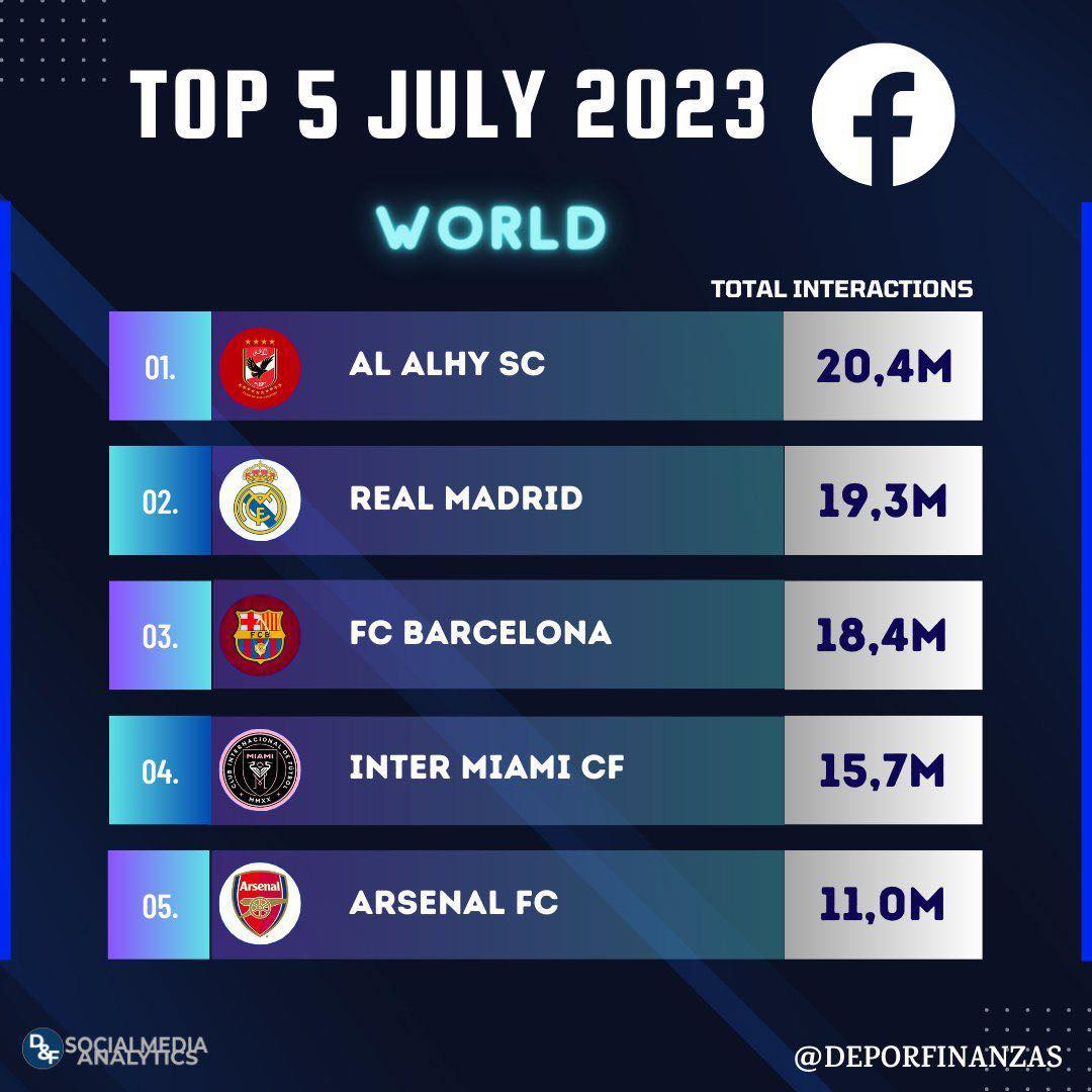 وظهر فريق إنتر ميامي الأمريكي في القائمة محتلًا المركز الرابع 15،7 وجاء أرسنال الإنجليزي في المركز الخامس بإجمالي تفاعل 11 مليون.