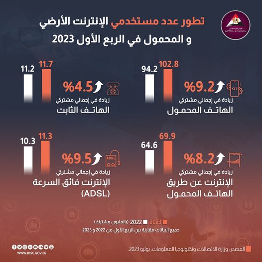 نشر المركز الإعلامي لـ مجلس الوزراء، إنفوجرافًا على صفحته الرسمية على موقع التواصل الاجتماعي فيسبوك، سلط الضوء من خلاله على تطور عدد مستخدمي الانترنت الأرضي والمحمول في الربع الرابع من عام 2023.