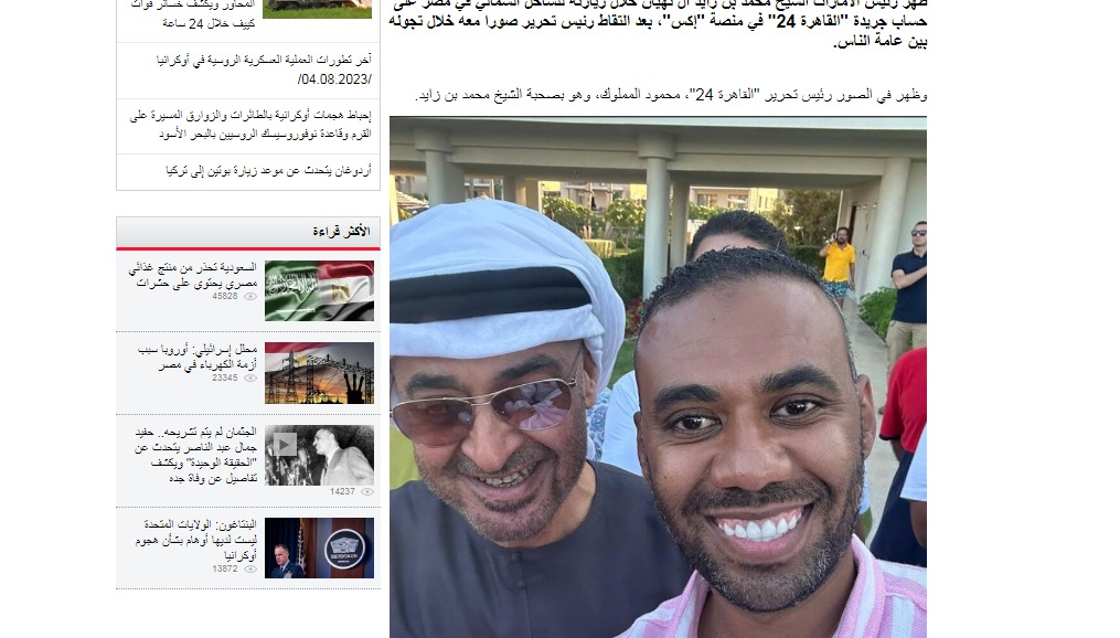 كما نشر موقع روسيا اليوم صورًا لمحمد بن زايد مع محمود المملوك، حيث أشاد رئيس دولة الإمارات بموقع القاهرة 24 أثناء وجوده مع رئيس تحريره.