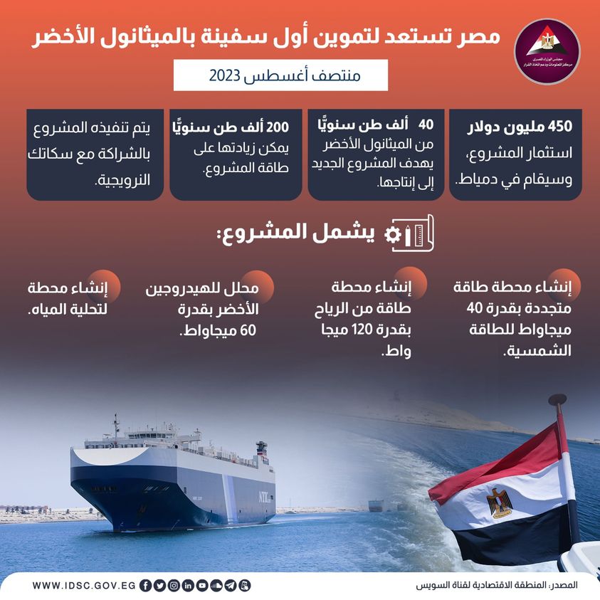 كشف مركز المعلومات ودعم اتخاذ القرار التابع لـ مجلس الوزراء، عن استعداد مصر لتمويل أول سفينة بالميثانول الأخضر منتصف أغسطس 2023.
