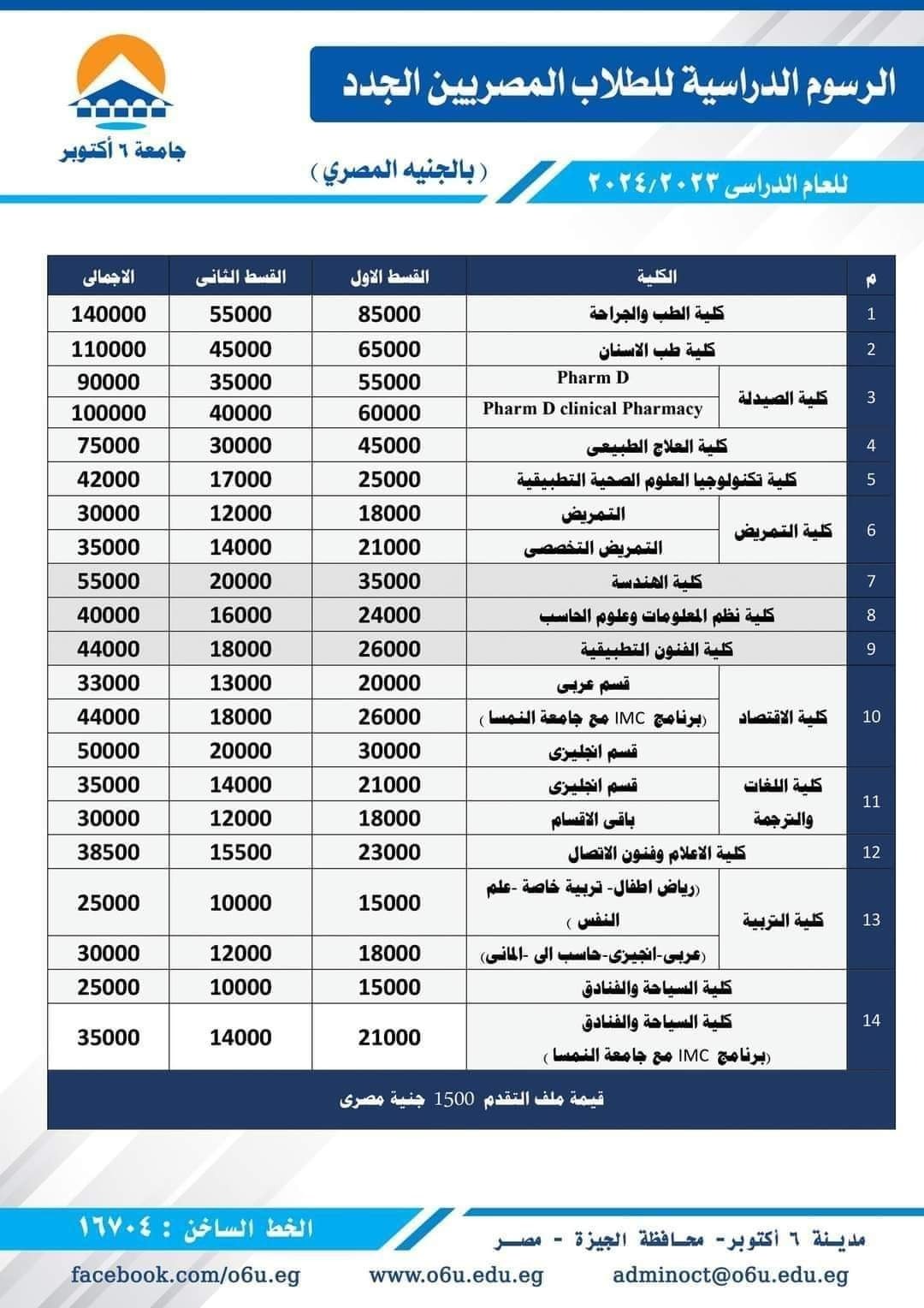 - مصاريف كلية التمريض جامعة 6 أكتوبر التمريض التخصصي 35 ألف جنيه القسط الأول 21 ألف جنيه والقسط الثاني 14 ألف جنيه.