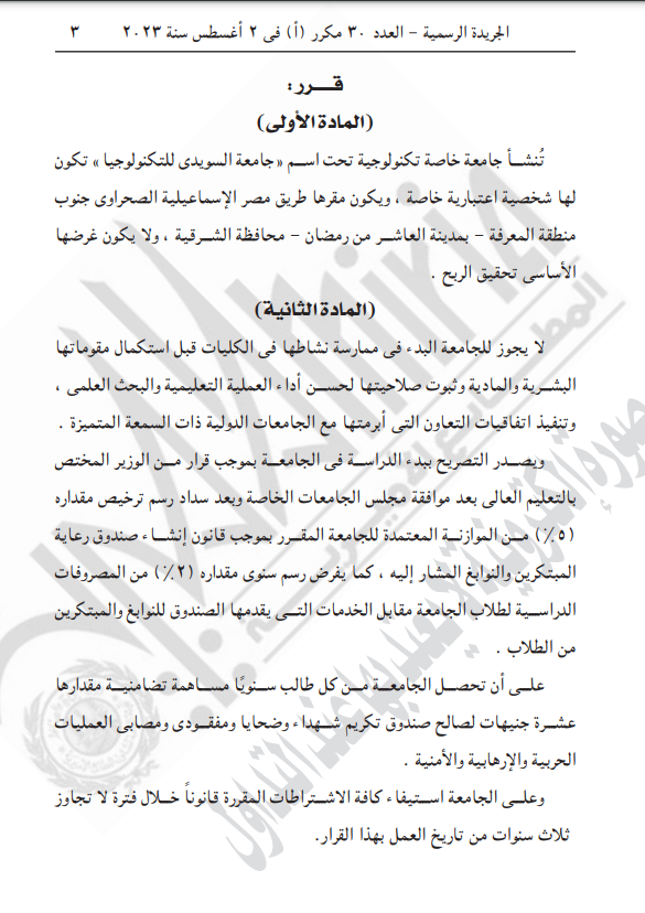 نشرت الجريدة الرسمية في عددها الصادر رقم 30 مكرر أ بتاريخ 2 أغسطس 2023، قرار رئيس الجمهورية بشأن إنشاء جامعة تكنولوجية خاصة باسم جامعة السويدي للتكنولوجيا.