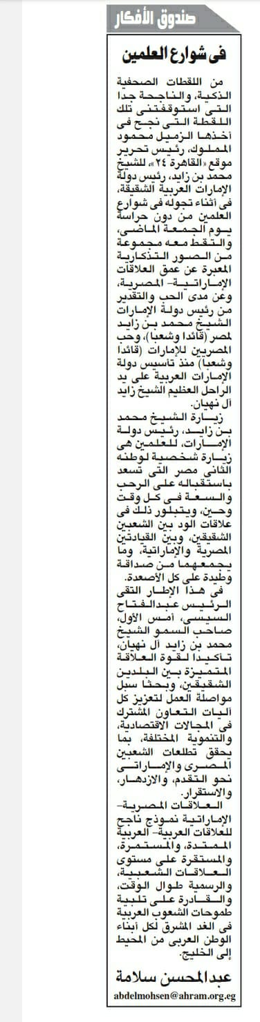 وقال سلامة في مقاله: من اللقطات الصحفية الذكية، والناجحة جدا التي استوقفتني تلك اللقطة التي نجح في أخذها الزميل محمود المملوك، رئيس تحرير موقع القاهرة 24 للشيخ محمد بن زايد رئيس دولة الإمارات العربية الشقيقة في أثناء تجوله في شوارع العلمين من دون حراسة يوم الجمعة الماضي والتقط معه مجموعة من الصور التذكارية المعبرة عن عمق العلاقات الإماراتية المصرية وعن مدى الحب والتقدير من رئيس دولة الإمارات الشيخ محمد بن زايد لمصر قائدا وشعبا، وحب المصريين للإمارات قائدا وشعبا منذ تأسيس دولة الإمارات العربية على يد الراحل العظيم الشيخ زايد آل نهيان.