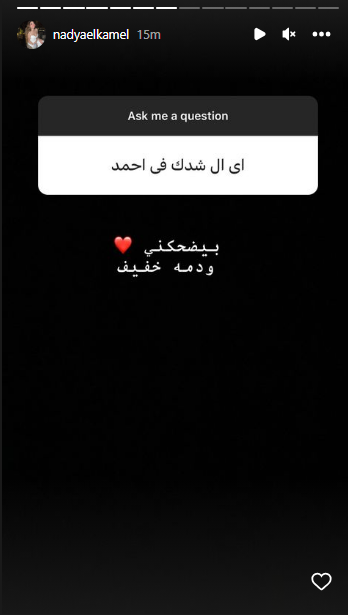 وعن أكثر شيء جذبها فيه قالت ندى الكامل: بيضحكني ودمه خفيف.