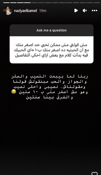 وردت ندى الكامل على سؤال متابعة سألتها عن تصريحها من قبل بأنها لن تتزوج شخصا أصغر منها، قائلة: مش قلتي مش ممكن تحبي حد أصغر منك مع إن اللي حبتيه ده أصغر منك بـ 10 سنين.