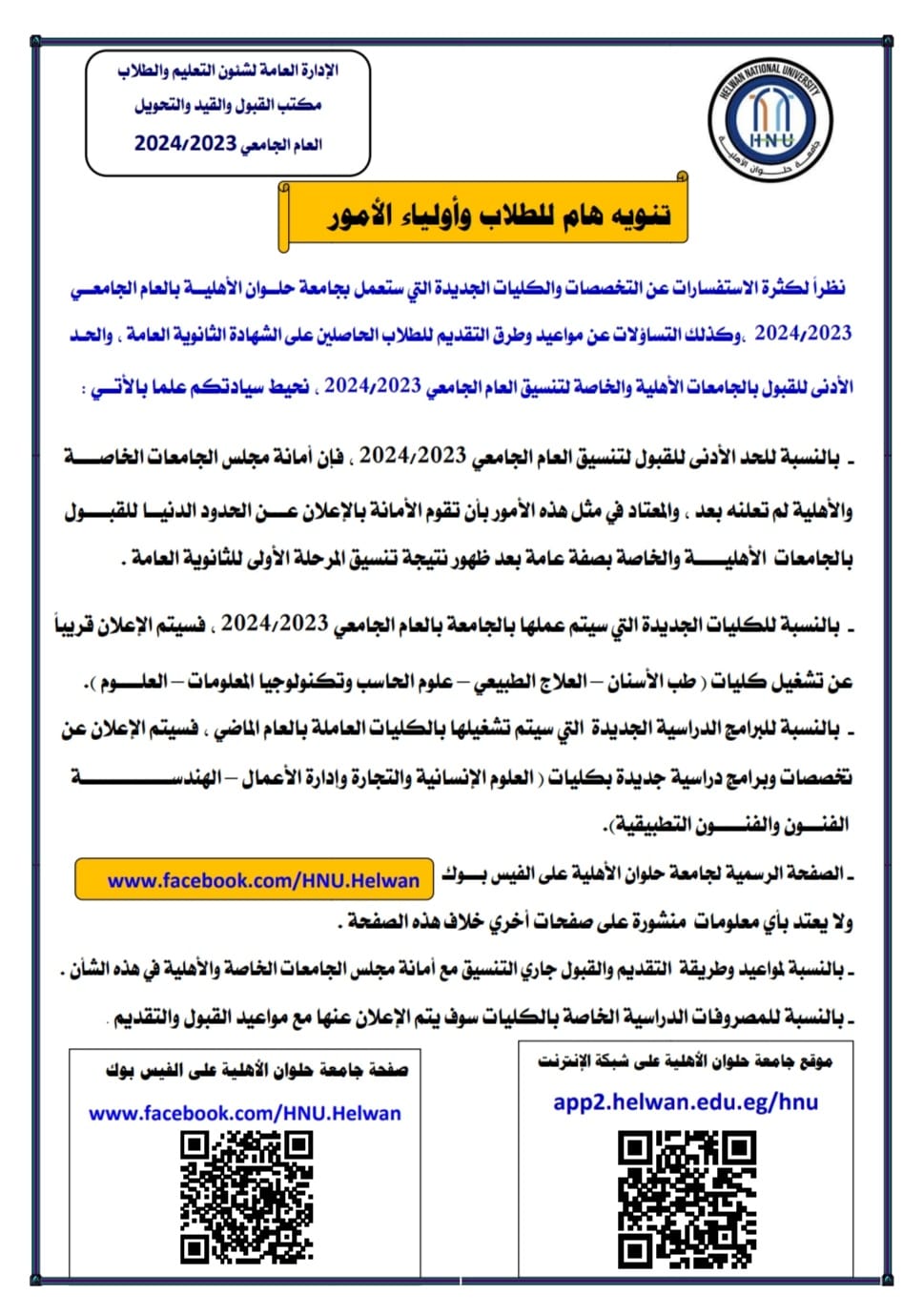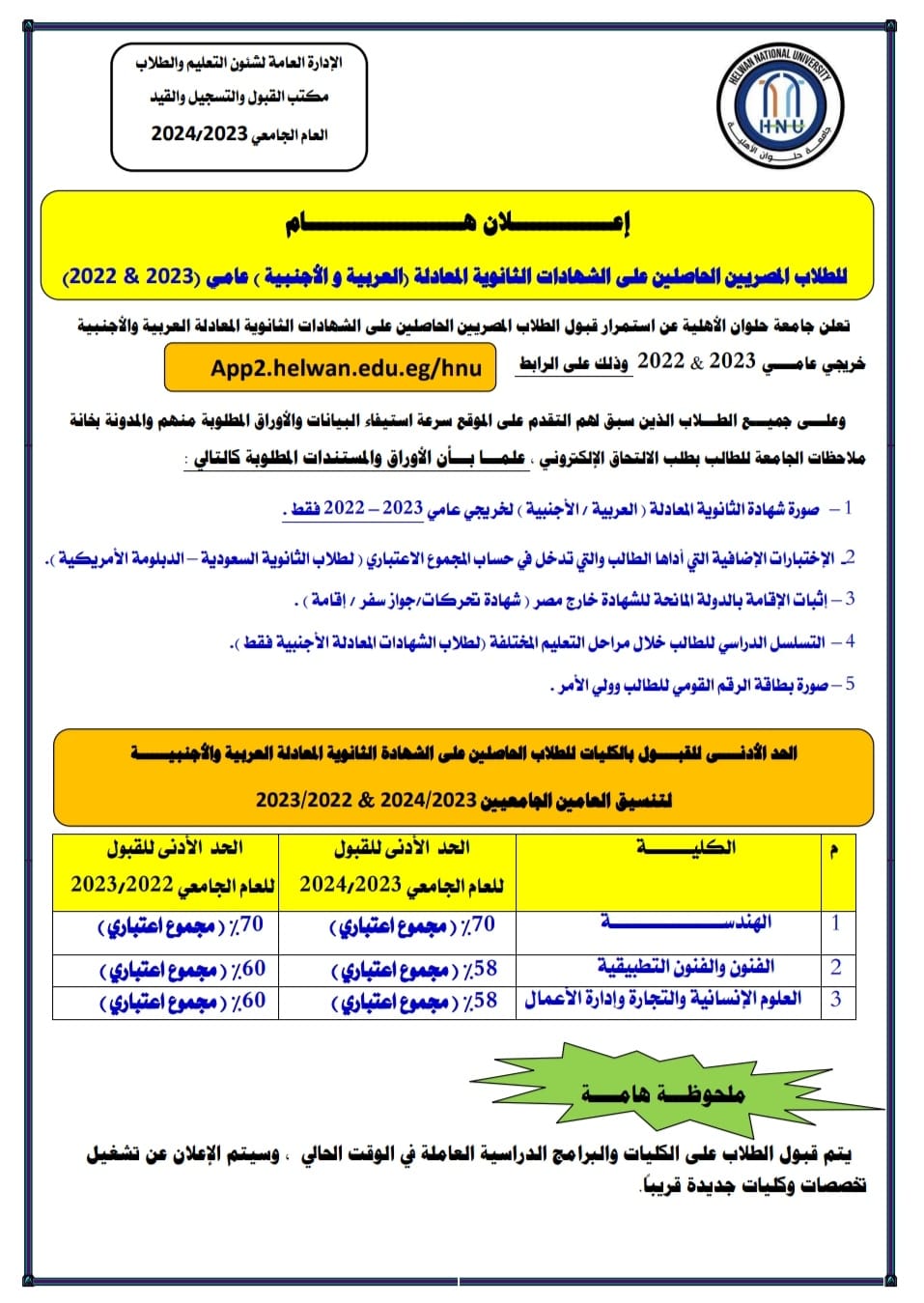 وتم إعلان تنسيق جامعة حلوان الأهلية لطلاب الشهادة الثانوية المعادلة العربية والأجنبية، كالتالي: