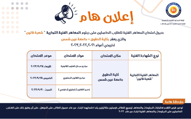 وقد تقرر جدول اختبارات الدبلومات الفنية 2023 للالتحاق بكلية الحقوق كالتالي: