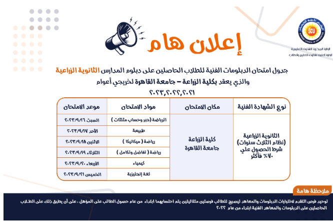 أما جدول اختبارات الدبلومات الفنية 2023 لكلية الزراعة فقد تم اعتماده كالتالي:
