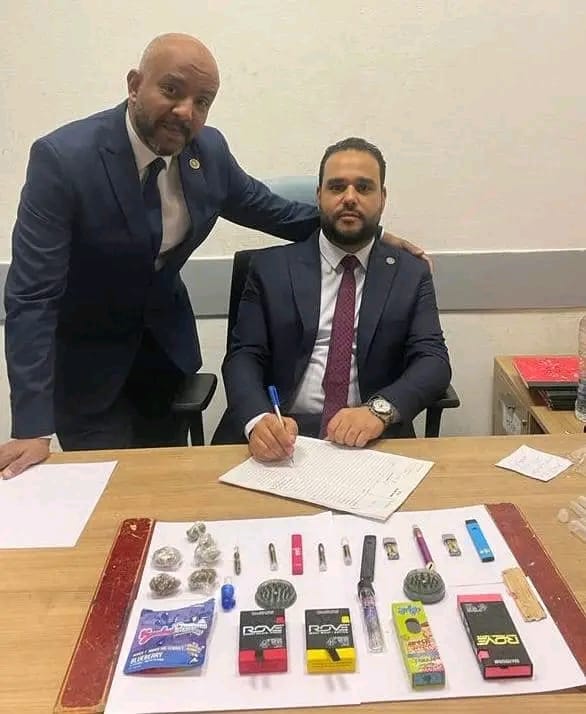 وبتفتيش حقائبة على جهاز الفحص بأشعة X-RAY بمعرفة إسلام غزالي مأمور الجمرك، فتلاحظ وجود كثافات عضوية داخل حقائب الراكب، قام وائل محمد إمبابي مدير الحركة بتكليف شريف محمد عيد مأمور الجمرك بتفتيش حقائب الراكب، فتبين وجود 5 لفافات من البلاستيك بداخلهم نبات الماريجوانا المخدر بوزن 14 جراما وكيس بداخله خمس قطع حلوى تحتوي على مادة THC المخدرة و4 سجائر إلكترونية بهم زيت الماريجوانا و6 "تانك" زجاجي بداخلهم نفس الزيت المخدر باجمالي 16 عبوة.