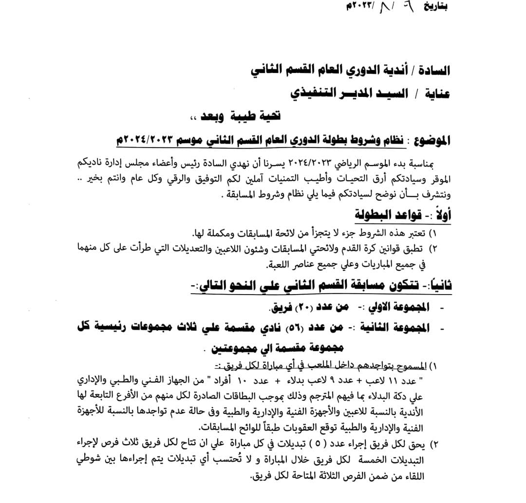 أرسل الاتحاد المصري لكرة القدم، نظام شروط بطولة الدوري العام القسم الثاني دوري المحترفين موسم 2023-2024، إلى الأندية المشاركة بالبطولة في موسمها الأول.