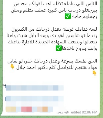 وكتب أدمن شاومينج على قناته السرية على “تيليجرام” والذي يقارب عدد الطلاب بها نحو 8 آلاف: الناس اللي عاملة تظلم أحب أقولكم محدش بيرجعلو درجات، ناس كتيرة عملت تظلم ومش رجعلهم حاجة.