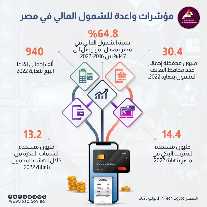 وأضاف معلومات الوزراء، خلال منشور له عبر صفحته الرسمية على فيسبوك، أن هناك مؤشرات واعدة للشمول المالي في مصر، و64.8% هي نسبة الشمول المالي في مصر بمعدل نمو وصل إلى %147 بين 2016-2022.