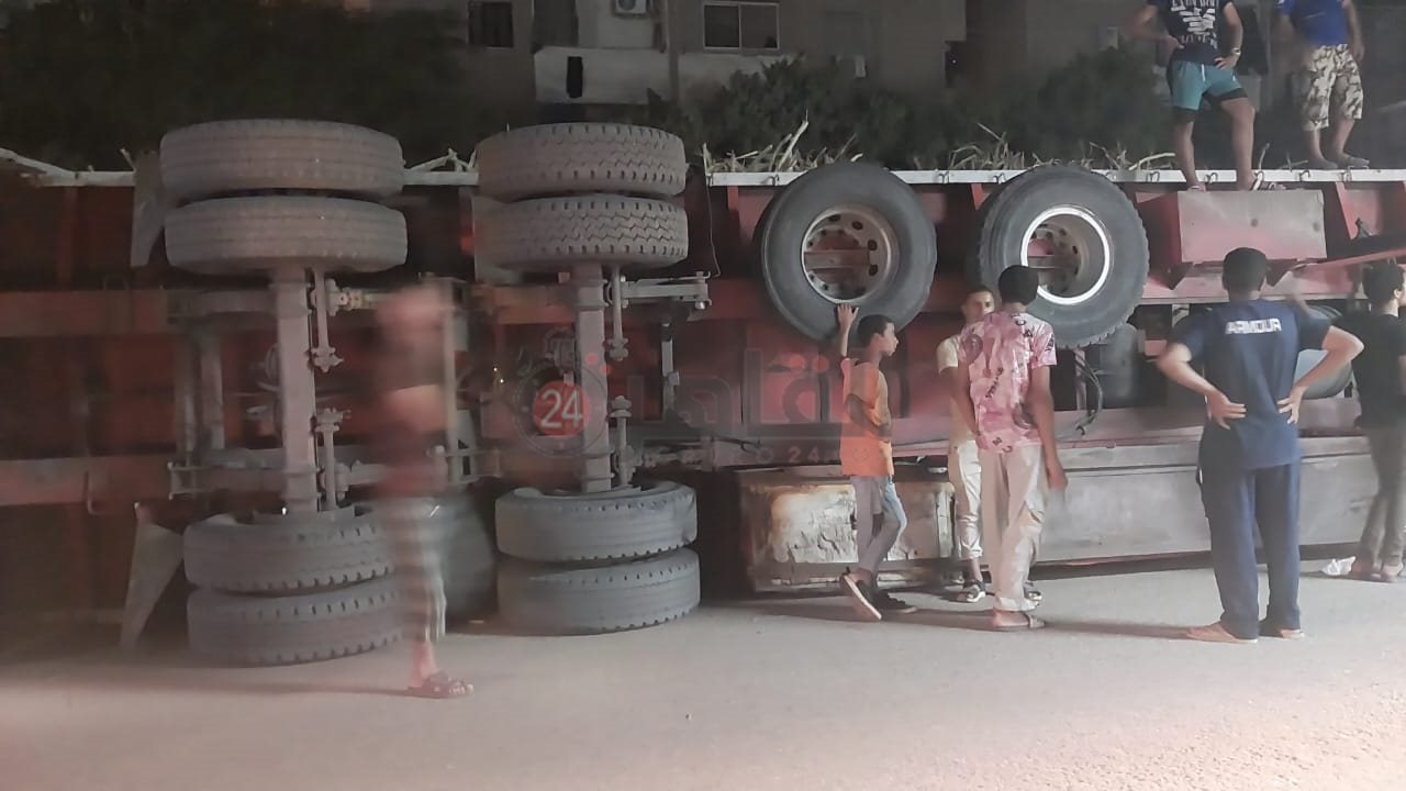 انقلاب تريلا محملة بالقصب على الطريق الزراعي