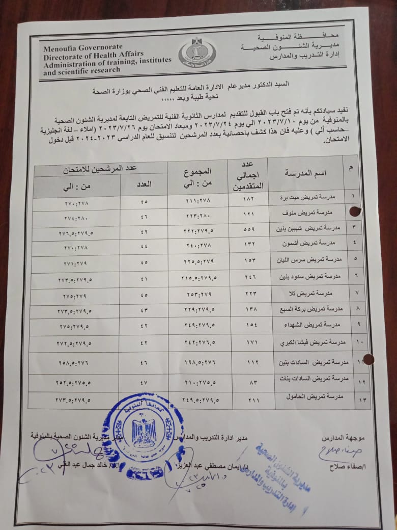أصبحت مدارس التمريض بمحافظة المنوفية وجهة أوائل الشهادة الإعدادية، لدرجة تقديم أوائل المحافظة الحاصلين على الدرجة النهائية للالتحاق بتلك المدارس المنتشرة في العديد من الأماكن.