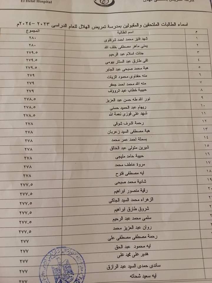 وحصل القاهرة 24 على نتيجة القبول في مدرسة التمريض التابعة لمستشفى الهلال بشبين الكوم، حيث تبين نجاح كل من شهد فأبو شرقاوي، يمنى ماهر خلف الله، أوائل الشهادة الإعدادية بالمنوفية والحاصلتين على الدرجات النهائية، كما أوضح كشف النجاح والبالغ 35 طالبة بالمدرسة أن أقل مجموع في المقبولين بلغ 277 درجة.